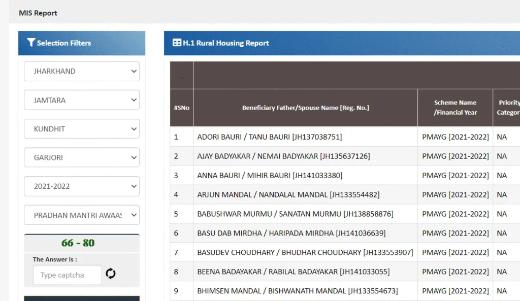 - अब आपके सामने PM आवास MIS रिपोर्ट फॉर्म खुलेगा, इसमें अपने राज्य का नाम झारखंड, अपना जिला, अपना ब्लॉक और कैप्चा दर्ज कर सबमिट पर क्लिक करे।